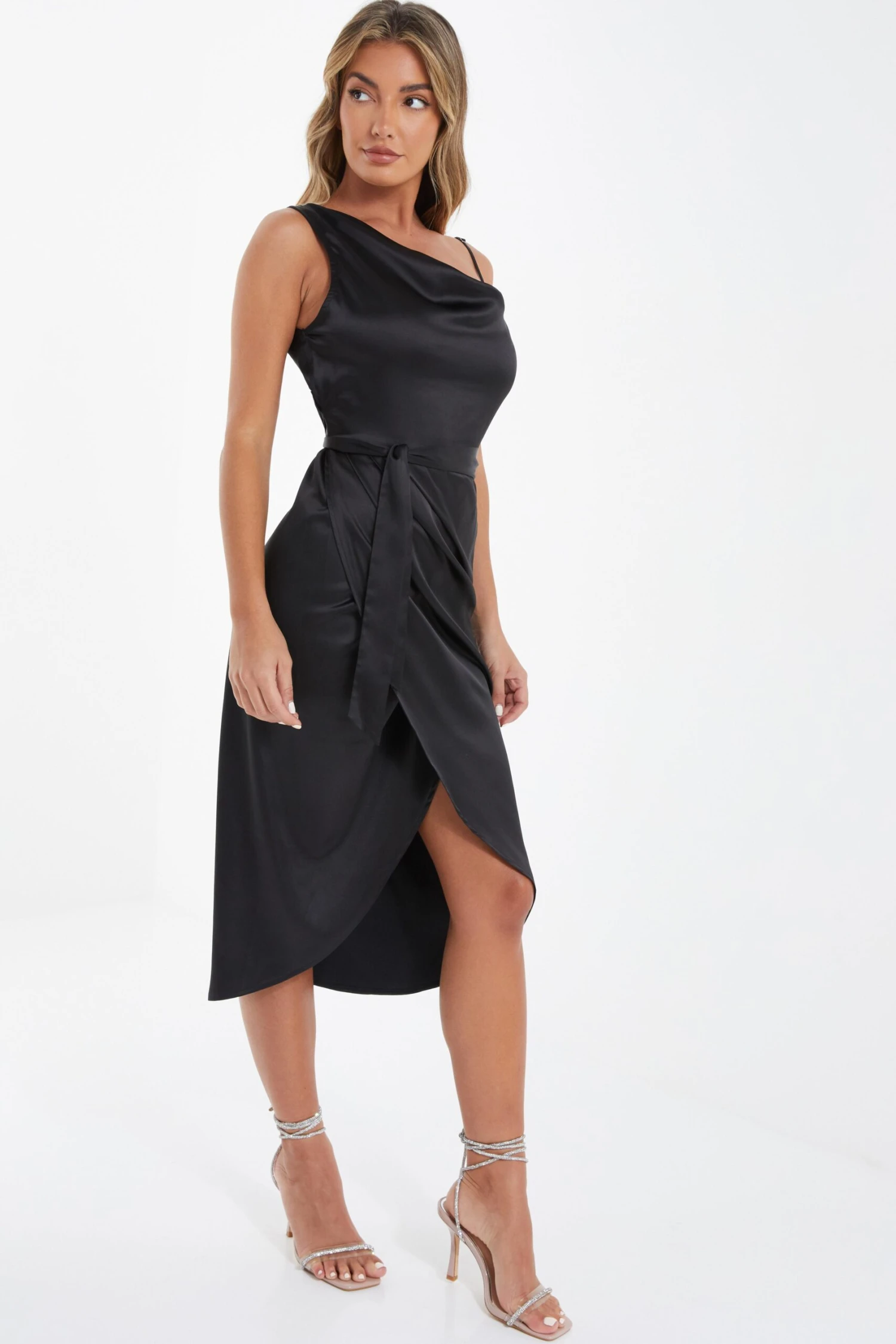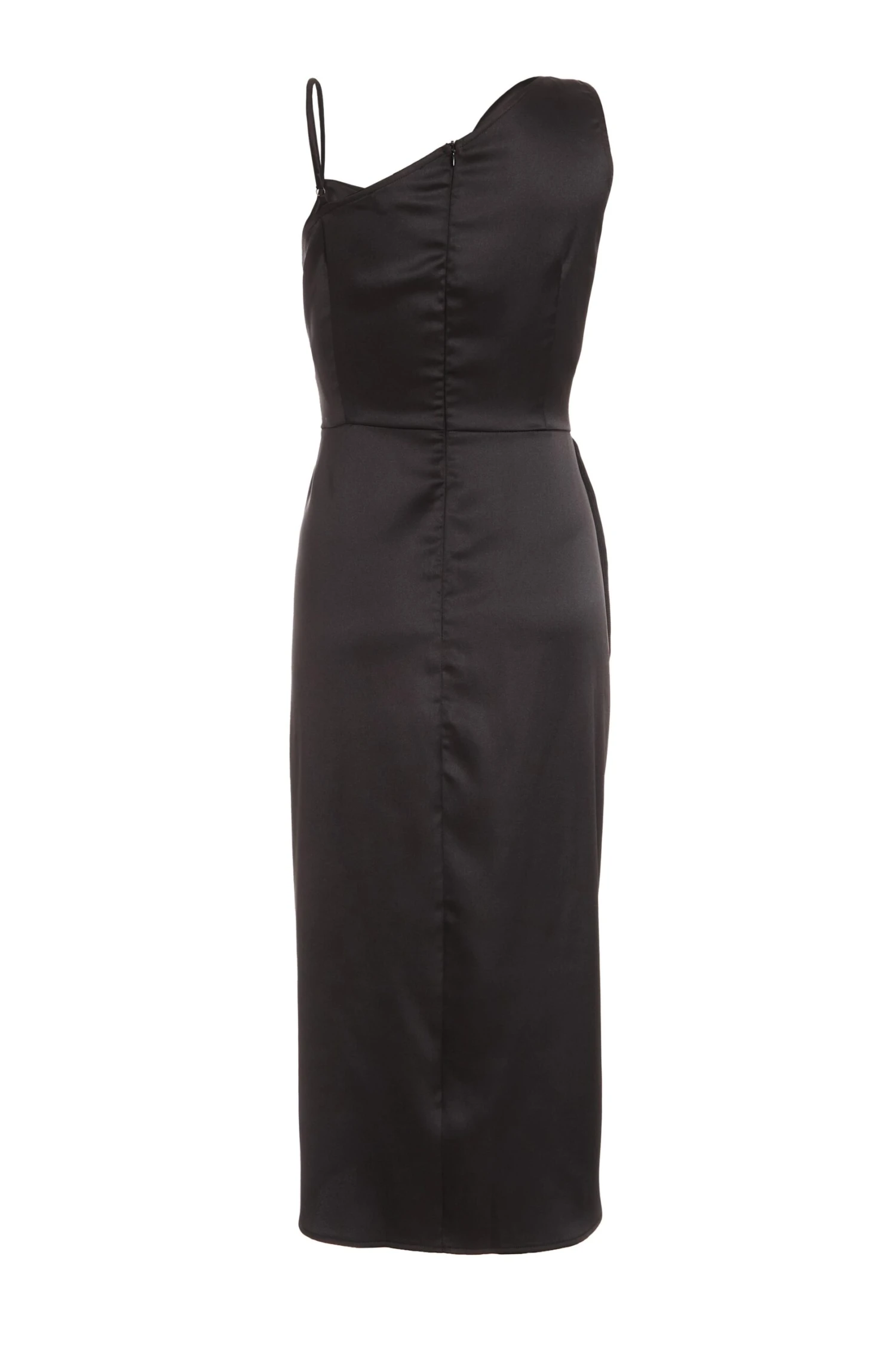 Black Satin One Shoulder Midi Dress